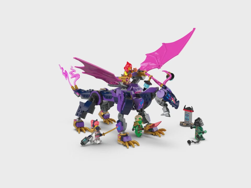 - Figura articulada de un dragón: Este gran modelo de un dragón cuenta con cola, patas, alas, cabeza y mandíbula articuladas, 2 posiciones en el lomo para una minifigura y también un cañón que dispara bajo cada ala
